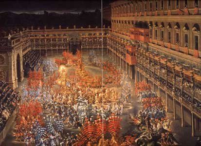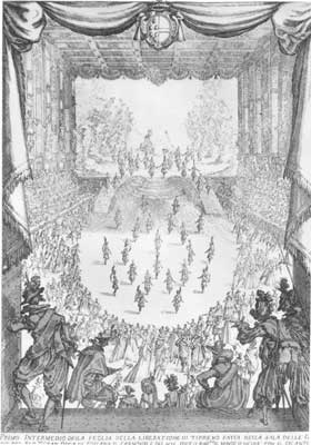 | Court entertainments were tools of politics as well as mere amusements. In 1653 Louis XIV danced as the Sun King in the Ballet royal de la nuit, and so established not only the definitive icon but also the practice of his autocracy. The entertainments produced by the Barberini family to greet the ex-Queen of Sweden, Christina, to Rome in 1656, included not only the Amazon ballet of warrior maidens pictured above but also a new opera written especially for the occasion - the latter a very sophisticated illustration of the problems of an intelligent and passionate woman. Throughout the small princely states of Italy and the Empire it became de rigueur to have a court theatre of one's own. The scale of these entertainments varied enormously from court to court, and it is worth remembering that although the courts of James VI and I and of Charles I in London spent a great deal of money and effort on spectacular masques, the subsequent reign of Cromwell and the Puritan Commonwealth put an emphatic stop to such things. When Charles II finally returned in 1660 the court had no money for spectacle on a continental scale - there were small shows at court (Dido and Aeneas may have started as such a show) but otherwise the King and his family went to the public commercial theatre like everyone else. |