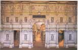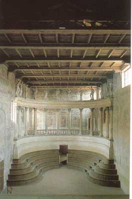 Right: an entertainment in Florence in 1616, showing the dancers bursting out into the auditorium. The general audience (if it got a seat at all) would have been crammed onto large steps in the style of the classical auditorium - seats would be reserved for the most important people. Left: the auditorium of the Gonzaga court theatre at Sabbioneta, near Mantua. |