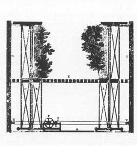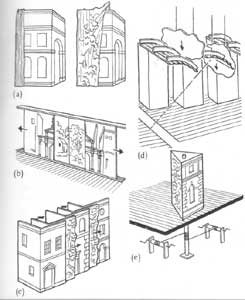 Left: from Richard Leacroft's invaluable book The Development of the English Playhouse . This shows the kinds of scene changes possible in the early 17th century. Flats were built at right angles to support each other and give a three-dimensional effect - this was excellent for city scenes, but not so convincing when a curtain painted with trees was draped over it. They were also awkward to change, and even though variations like the three-sided periaktoi were tried, it was not until Torelli invented the sliding flat system (seen on the right) in the 1640's that baroque theatrical spectacle really took off. This system was so efficient that it remained standard in many theatres until the late 19th century. A fully working system was preserved at Drottningholm in Sweden and can still be seen today. The change of scene takes about 10 seconds, and, since there is no front curtain, everything can be seen happening. |